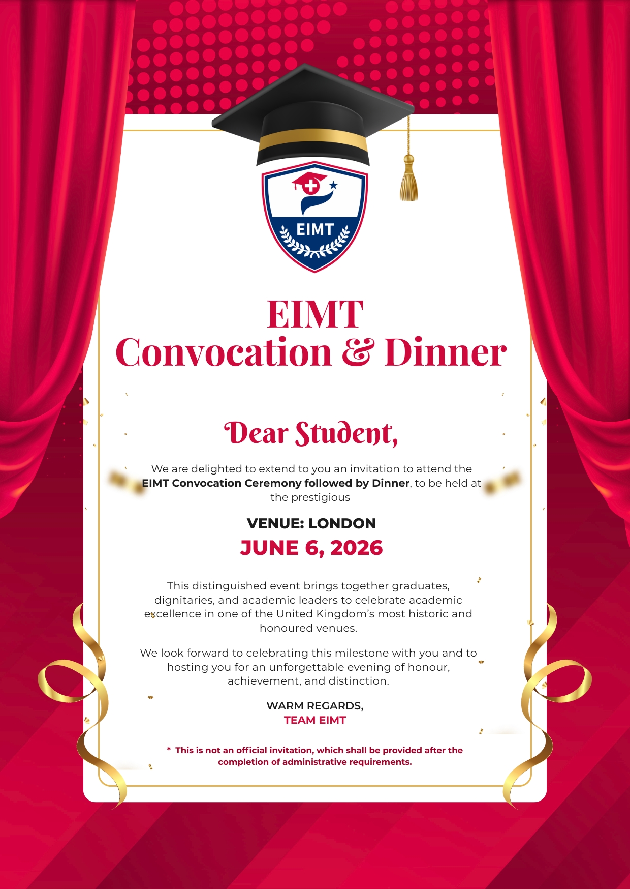 We are truly pleased to invite you to attend the EIMT Convocation Ceremony, followed by a formal dinner, in London on 6 June 2026.