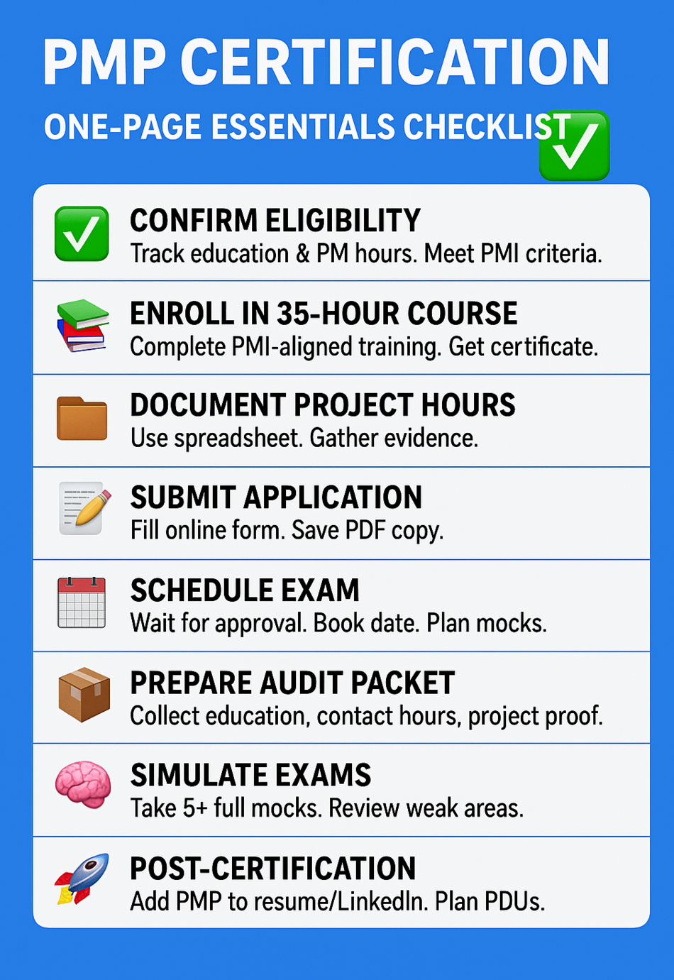 With this roadmap, you now have a clear path from confirming eligibility to exam day, audit preparation, and maintaining your PMP credential. The next step is to put the plan into action: organize your project hours, schedule study sessions, and employ the right tools to track your progress. Taking these concrete steps will keep you focused, ensure you meet PMI requirements, and set you up for a successful PMP certification journey. Your preparation today lays the foundation for career growth and recognition as a certified project management professional.