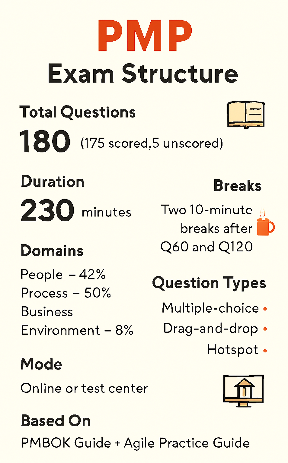 The current PMP exam is aligned with the PMBOK® Guide – Seventh Edition and the Agile Practice Guide, which means candidates are tested not only on predictive methods but also on agile and hybrid practices.
